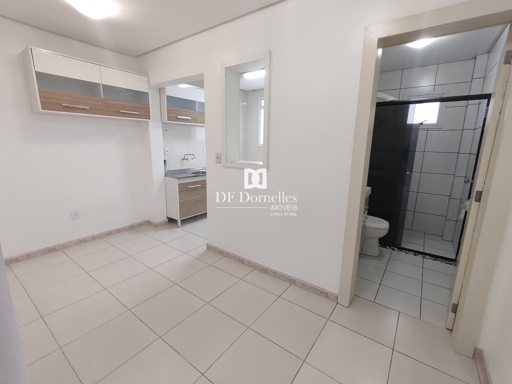 Apartamento com 01 dormitório, sala de estar com sacada, banheiro social, sala de jantar, cozinha com área de serviço, espera para água quente e garagem coberta.