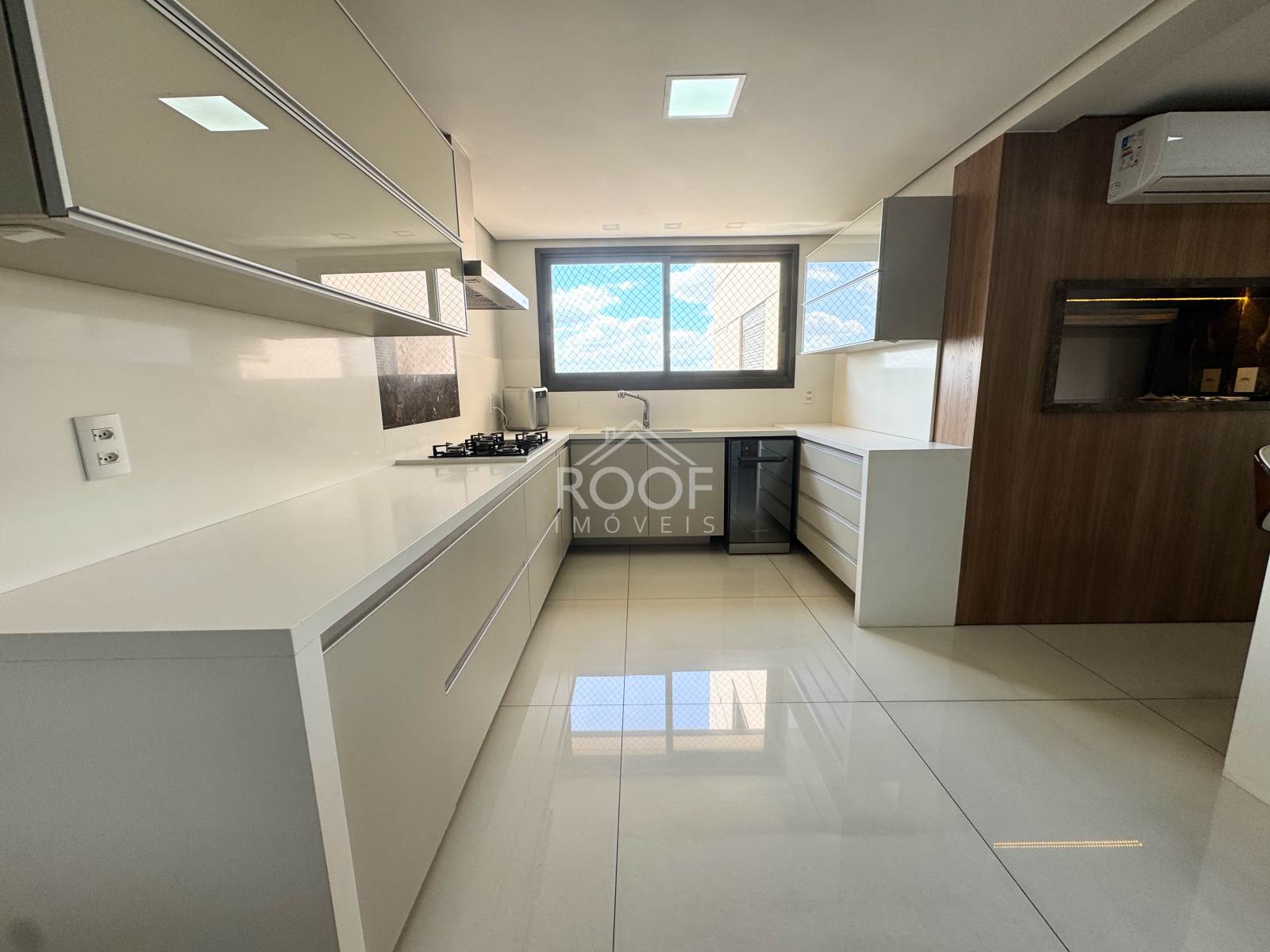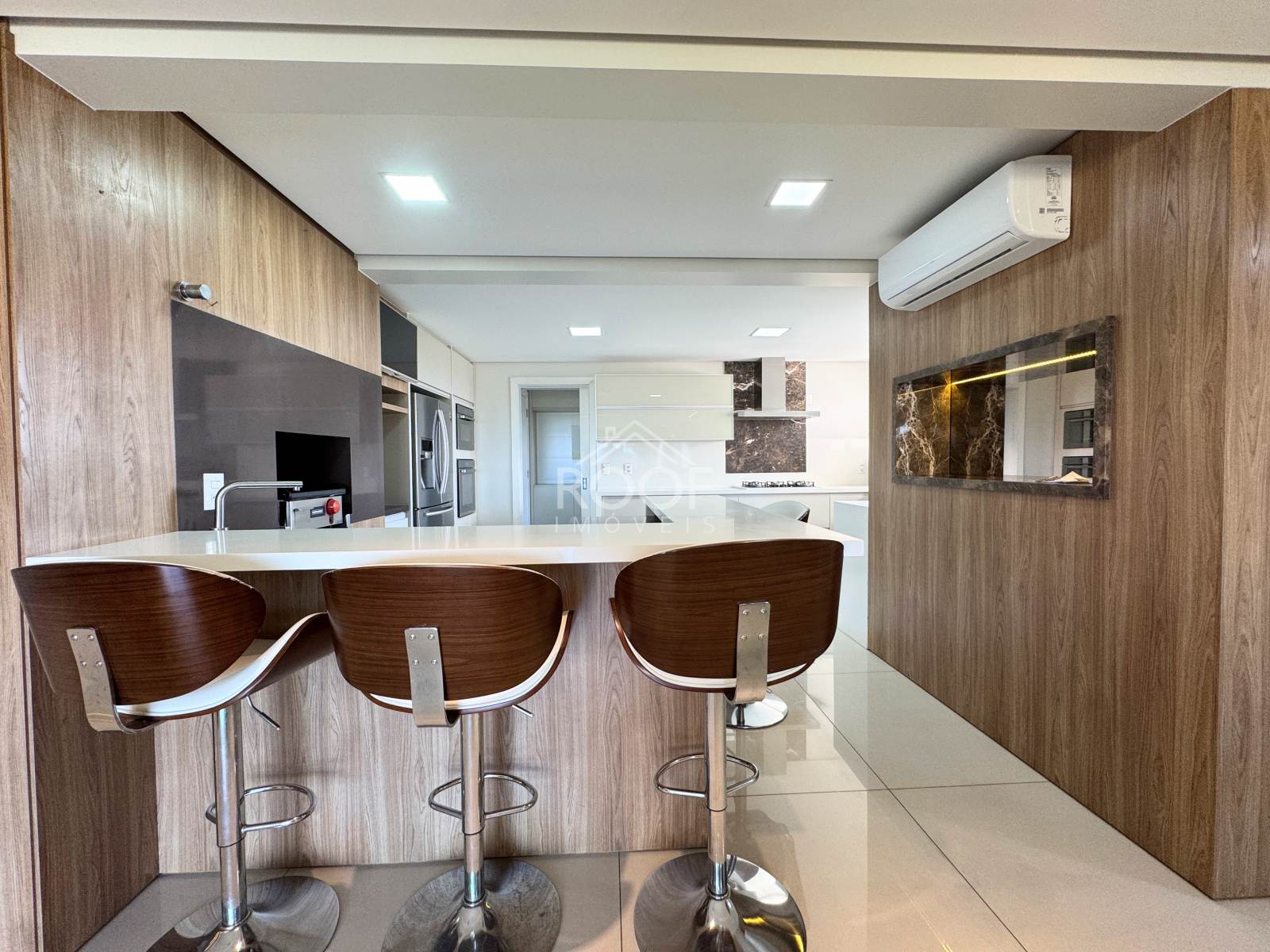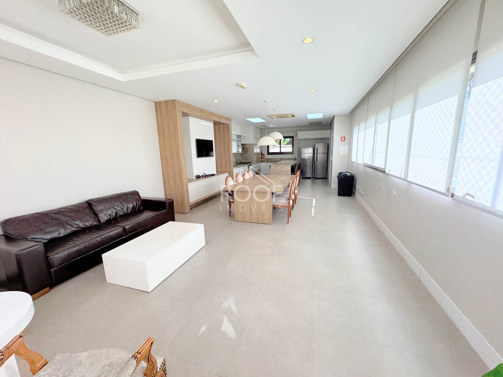 Living integrado com sala de estar, jantar e cozinha gourmet equipada – ideal para receber com estilo